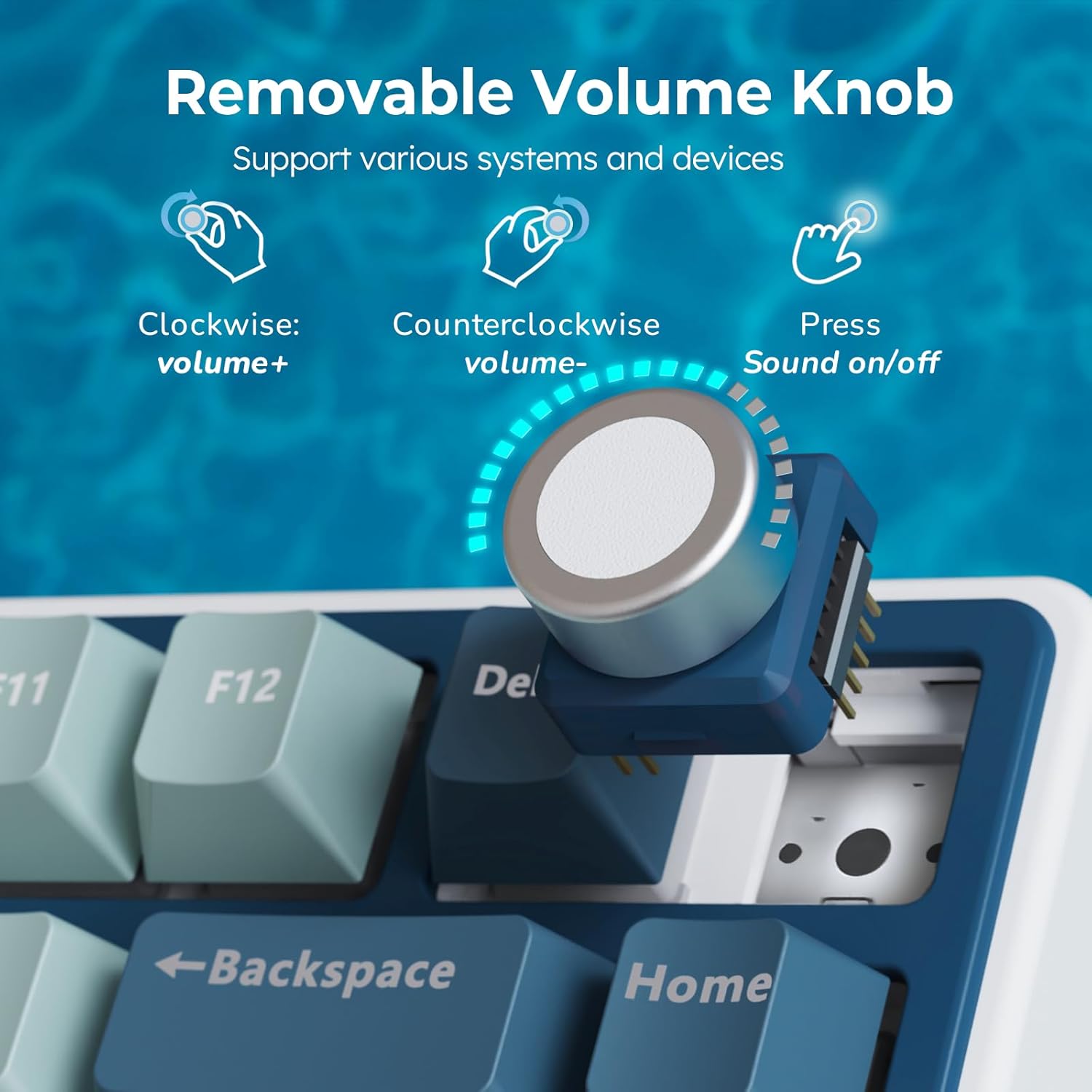 CNC Metal Volume Knob: Custom keyboard features a CNC metal knob, allowing you to adjust the volume by rotating it and mute/unmute by pressing it. The knob is hot-swappable and programmable, and you can replace it with the included cream switches. Whether you use it for multimedia control or as a custom key, it can meet your needs