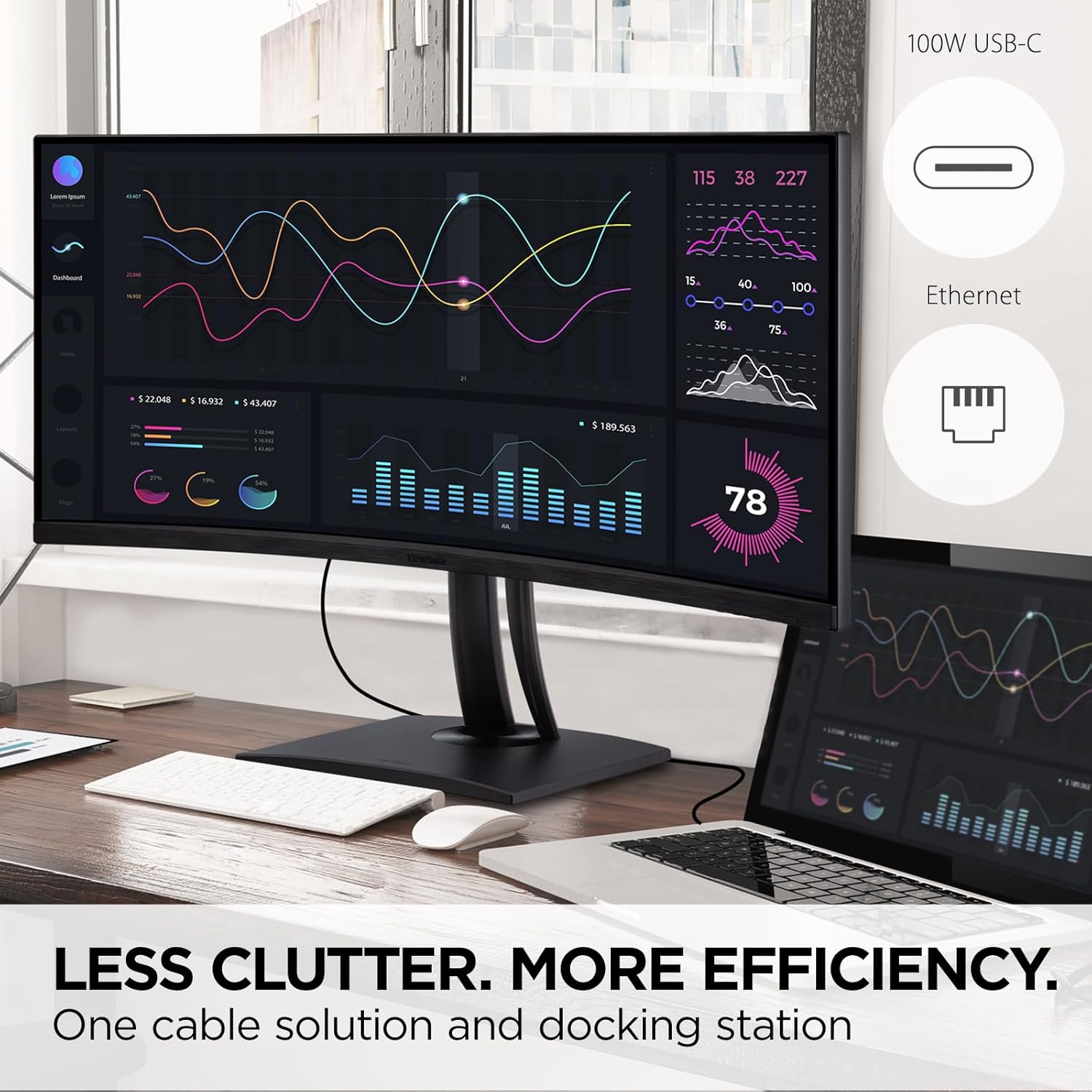With an immersive curved screen and stunning WQHD+ 3440×1440 resolution, the ViewSonic® ColorPro® VP3456a monitor elevates your viewing experience from flat to panoramic. Delivering incredible detail and vivid colors across wide viewing angles, this monitor is engineered to provide precise color accuracy. Thanks to an expansive 34” frameless screen, ultra-wide 21:9 aspect ratio, and integrated speakers, this monitor is ideal for video editing, content development, and other color-critical applications. With a sleek and modern design, the VP3456a features a future-proof USB Type-C port with 100W charging, as well as DisplayPort technology, and HDMI. Enjoy reliable network connectivity with the integrated Ethernet port while the integrated USB hub also provides single-cable simplicity for connecting and charging your peripherals and accessories. The VP3456a provides an amazing Delta E<2 value and 99%* sRGB color accuracy for incredible and precise color accuracy. An integrated color uniformity function ensures consistent chromaticity across the screen, while a 14-bit 3D look-up table generates a stunningly smooth palette of 4.39 trillion colors, making it an ideal set-up for photographers, creatives, and designers.