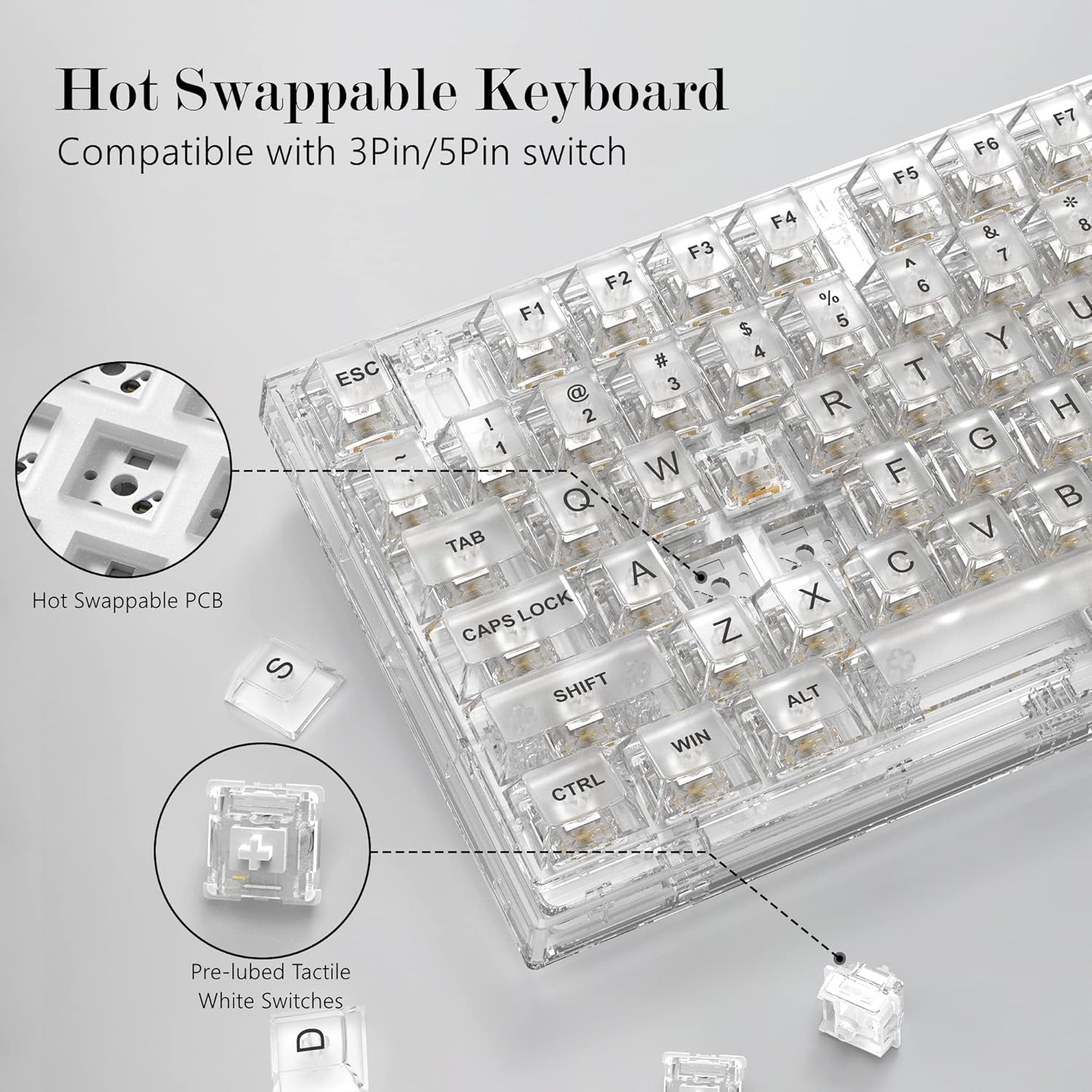 【Hot Swappable Clear Keyboard】K75 is equipped with hot-swappable PCB to ensure free replacement or change of switches. It is compatible with most 3-pin and 5-pin mechanical switches. Pre-installed the pre-lubed custom tactile switches providing unrivaled tactile responsiveness with up to 50 million keystroke lifespan.