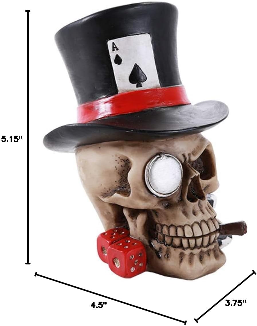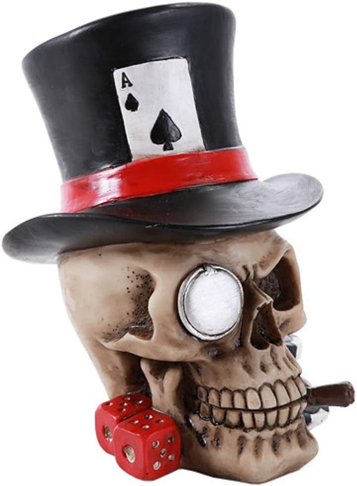 Ace of Spades Top Hat Poker Skull figurine measuring 5 inch tall. Made of cold cast resin and hand painted. Great gift idea for any poker game lover!