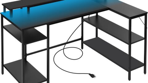 Panana L Shaped Computer Desk with LED Lights and Power Outlet, Reversible Corner Office Desk with Monitor Stand and Shelves, Gaming Desk with Shelves for Home Office Bedroom (Black)