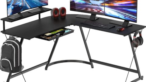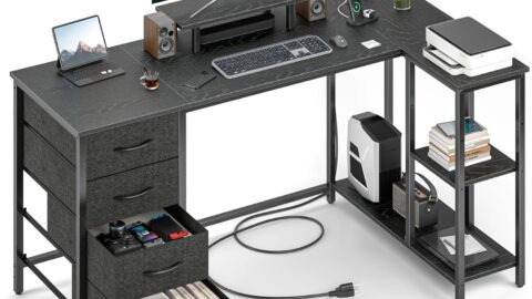 55″ L Shaped Computer Desk with 4 Drawers and Power Outlet, Corner Desk with Monitor Stand & Reversible Storage Shelves, Writing Study Gaming Desks for Bedroom Office, Black