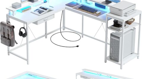 Jojoka L Shaped Gaming Desk,68″ Computer Desk with Power Outlets & LED Lights, Home Office Desk with File Drawer, Corner Desk with Monitor Shelf and Hook, Two Person Desk (White)