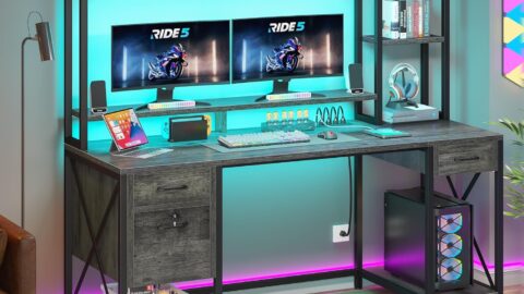 YITAHOME Computer Desk with Drawers & Power Outlets, 59″ Home Office Desk with Hutch, Gaming Desk with LED Lights, Grey