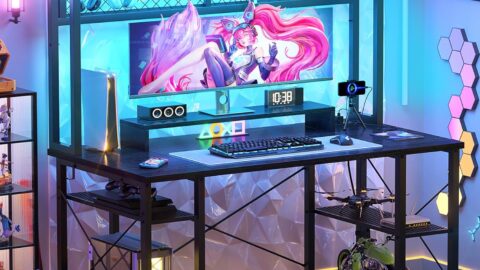 Gaming Desk with Hutch – 47 Inch Computer Desk with LED Lights & Power Outlet, Home Office Writing Desk with Storage Shelf and Monitor Stand, Black