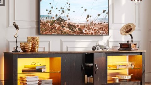 Bestier LED TV Stand with Power Outlets for 55/60/65 Inch TV, Gaming Entertainment Center with Cabinet for PS5, Modern TV Cabinet with Adjustable Glass Shelves for Living Room 58 Inch,Black Marble