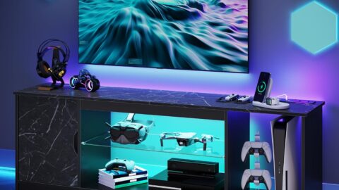 Bestier Led Entertainment Center for PS5,Xbox,Gaming TV Stand with Cabinet for 60/65 Inch TV, Modern TV Console with Adjustable Glass Shelf for Living Room Easy Assembly Black Marble