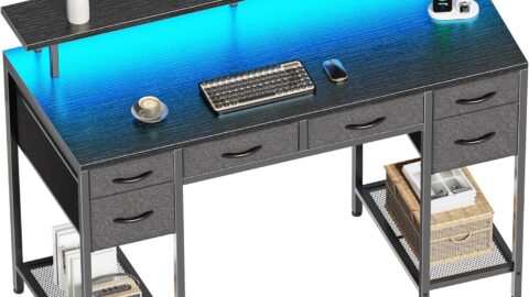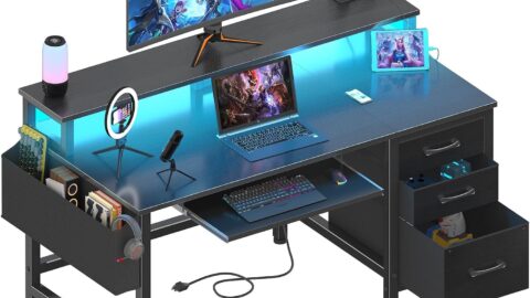 Huuger 47 Inch Computer Desk with Power Outlets and LED Lights, Gaming Desk with 4 Drawers, Office Desk with Monitor Stand, Study Desk Work Desk for Home Office, Small Spaces, Black