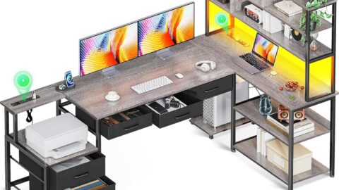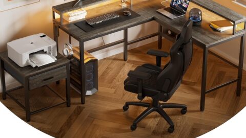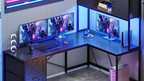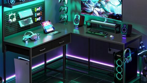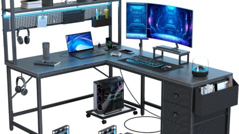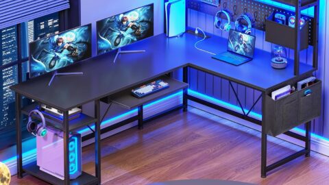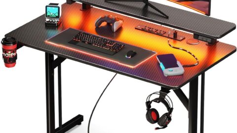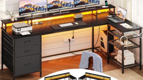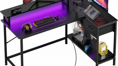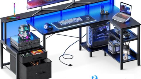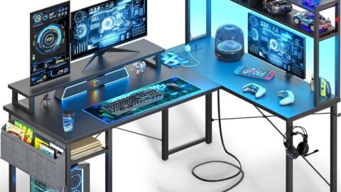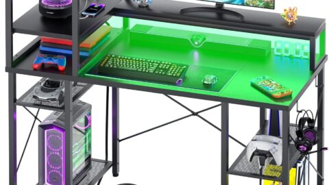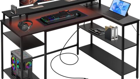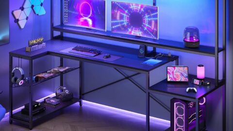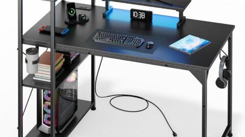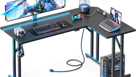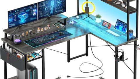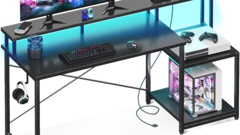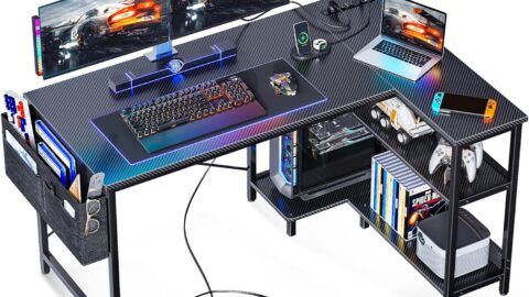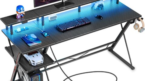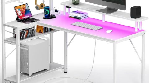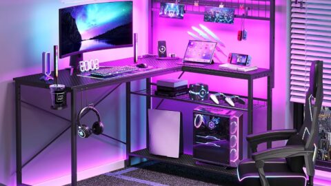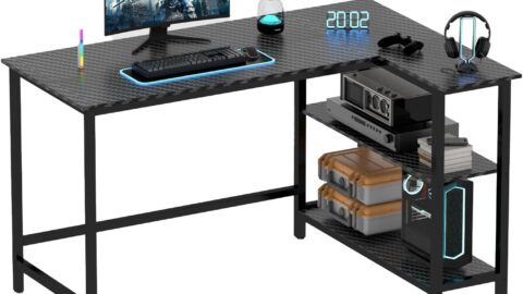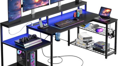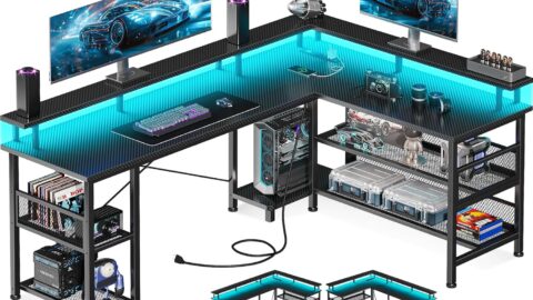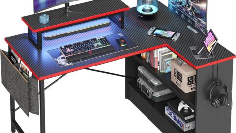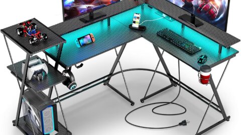 Bestier Gaming Desk 51″ L-Shaped, with Power Outlets & LED Lights- 4 Tier Shelves, Reversible Gamer Table with Hooks & Cup Holder for Home Office Carbon Fiber Black