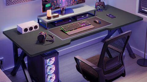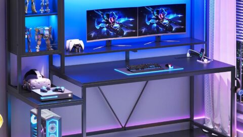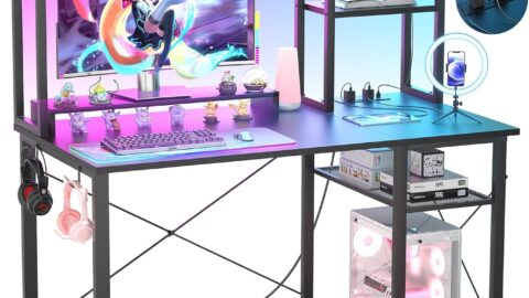 Gaming Desk with Hutch – 47 Inch Computer Desk with LED Lights & Power Outlet, Home Office Writing Desk with Storage Shelf and Monitor Stand, Black