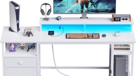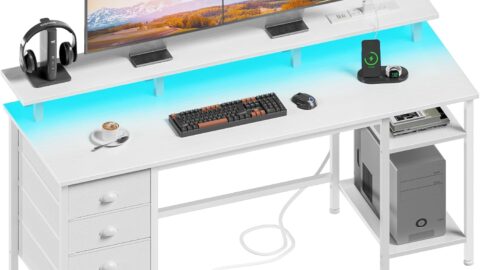 Furologee 61″ Desk with LED Light & Power Outlets, Reversible Computer Desk with File Cabinet & Drawer, White Gaming Desk Writing Table with Dual Monitor Stand, for Home/Office/White