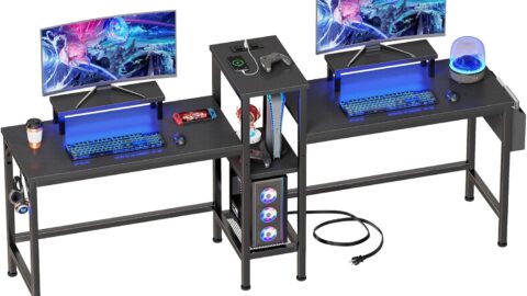 Furologee 2 Person Gaming Desk with LED Lights, 71 Inch Computer Desk with Power Outlets and Monitor Stand, Double Desk with Storage Bag and Headphone Hooks, Study Writing Table for Home Office, Black