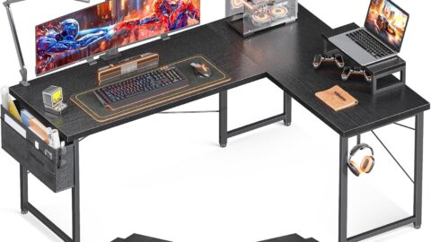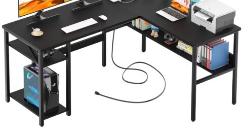 Unikito Reversible L Shaped Desk with Magic Power Outlets and USB Charging Ports, Sturdy Corner Computer Desk with Storage Shelves, Gaming Table Home Office Desk, Easy to Assemble, Black