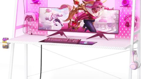 Gaming Desk with Hutch and LED Lights, Gaming Computer Desk with Power Outlets, Gamer Desk with Storage Shelves, PC Gaming Desk with Pegboards for Bedroom, Carbon Fiber White, 49″