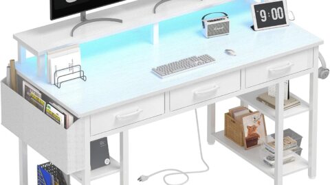 Lufeiya White Computer Desk with Fabric Drawers and Storage Shelves, 47 inch Home Office Desk with Monitor Stand, Gaming Desk with LED Lights and Power Outlets, White