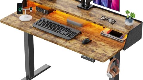 ErGear Standing Desk with LED Strip, 48″ x 24″ Electric Height Adjustable RGB Gaming Desk with Shelf, Sit Stand Desk with Dual Cable Holes, C-Clamp Mount Compatible, 4 Preset Heights, Vintage Brown