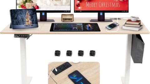 55×24 Inch Electric Height Adjustable Standing Desk with Cable Management, Acceptable 220V,Splice Board, Mouse Pad, 2-Outlet Power Strip with USB 20W Charger, and Casters(White Frame&Log Top)