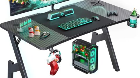 HLDIRECT 55 Inch Gaming Desk with Carbon Fibre Surface Large Computer Desk Gaming Table Ergonomic Pc Gaming Workstation Home Office Desks with Cup Holder & Headphone Hook
