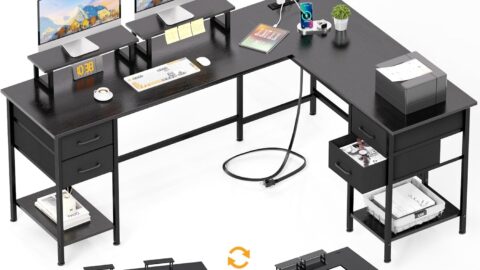 55″ L Shaped Computer Desk with 4 Drawers and Power Outlet, Corner Desk with Monitor Stand & Reversible Storage Shelves, Writing Study Gaming Desks for Bedroom Office, Black
