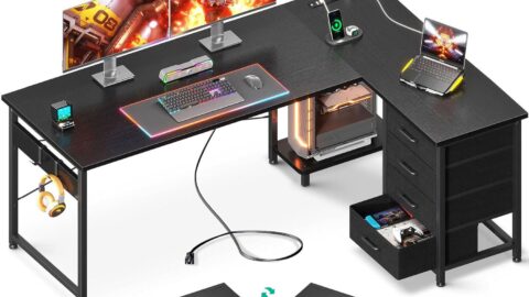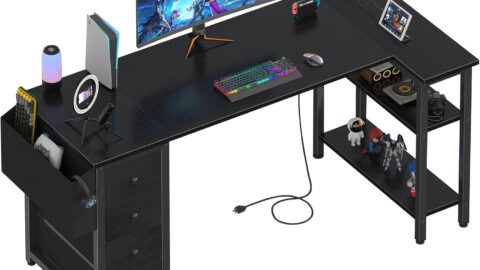 AODK L Shaped Desk with 4 Tier Drawers, 61″ Reversible Gaming Desk with Power Outlets, L Shaped Computer Desk with USB Charging Port and Host Stand, Home Office Corner Desk, Easy to Assemble, Black