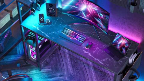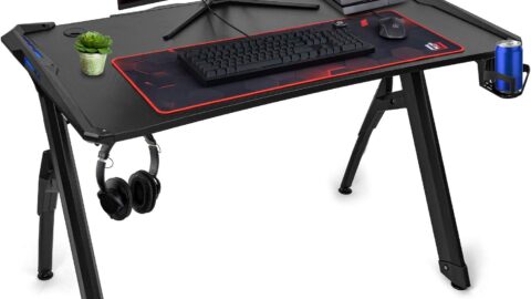 Deco Gear Ultrawide Curved LED Computer Gaming/Office Desk, Waterproof Carbon-Fiber Surface, Supports up to 175-lbs., 6-Color RGB Lighting Accents, Cable Management, Cup Holder, 31.5″ Mouse Pad