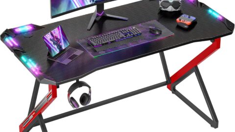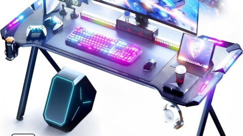 TIQLAB Gaming Desk with LED Lights, 47 Inch Computer Desk for Home Small Space, Gaming Table with Carbon Fiber Surface, PC Gamer Desk for Kids Boys Men, Black
