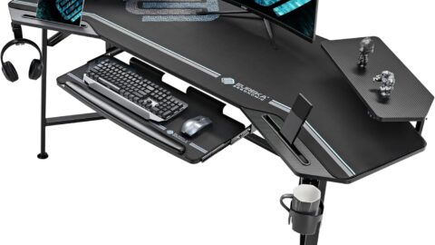 EUREKA ERGONOMIC Gaming Desk with Led Lights,72″ Large Wing-Shaped Studio Desk W Keyboard Tray, Computer Desk Table W Monitor Stand Dual Headphone Hanger Cup Holder for Live,Streamer,Black