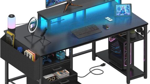 Lufeiya Gaming Desks with Led Lights and Power Outlets, 55 Inch Computer Desk with File Drawers Cabinet, Home Office Desk with Shelves Monitor Stand, Black