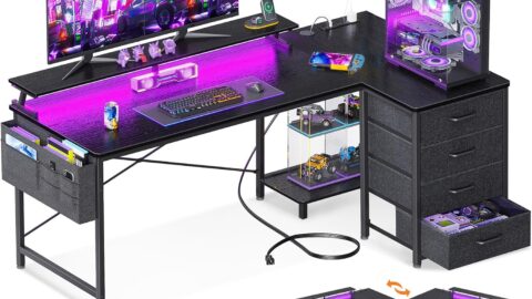 EnHomee 70.9″ L Shaped Gaming Desk with Drawers Reversible L Shaped Computer Desk with Power Outlet & LED Lights Home Office Desk with Storage Shelves and Monitor Stand Corner Desk, Black Carbon Fiber