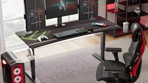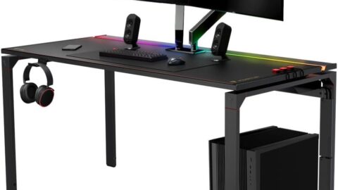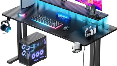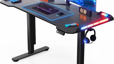Gaming Desk with LED Lights & APP Control, 48″ x 24″ Gaming Table with Music Sensing, Underdesk Cable Storage Electric Standing Desk, Black Carbon Fiber PC Desk for Gaming and Home Office