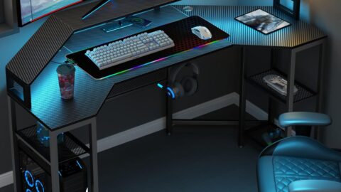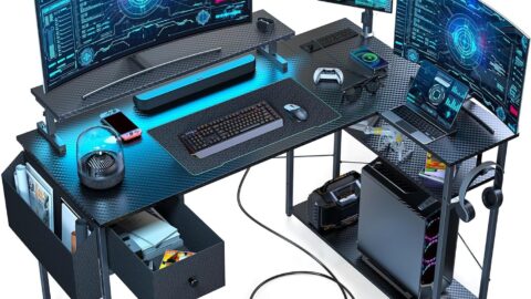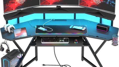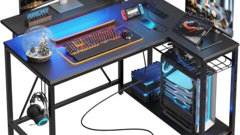 Gaming Desk, 47 inch L Shaped Gaming Desk, Computer Desk with LED Lights & Adjustable Stand, Power Outlets, Storage Drawer, Reversible Gaming Desk with Shelves, Hook, Black Carbon Fiber