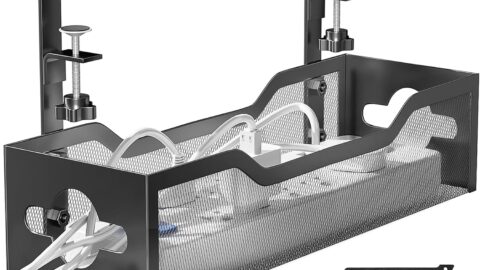Under Desk Cable Management Tray No Drill, Metal Mesh Cable Management Under Desk with Clamp Mount, 2 Hole Cable Tray with Desk Wire Management and Desk Cord Organizer for Home Office Standing Desk