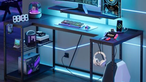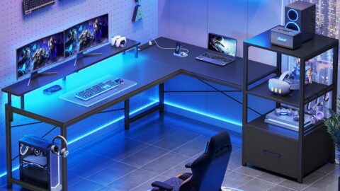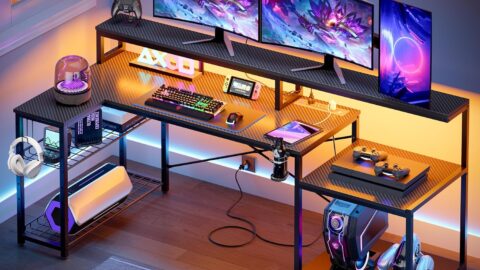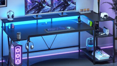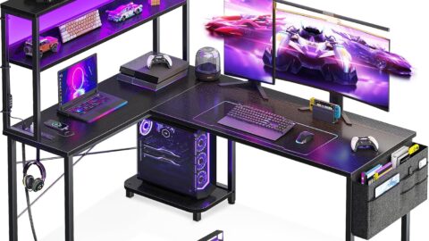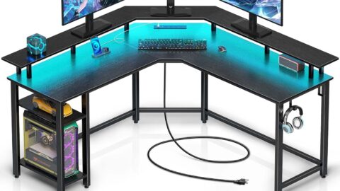 Rolanstar L Shaped Gaming Desk with LED Lights & Power Outlets, 55.1″ Computer Desk with Full Monitor Stand & Storage Shelf, Corner Desk with Hooks, Black Desk Reversible