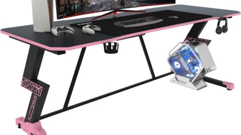 63 Inch Gaming Desk, with Carbon Fiber Surface, Lightning-Shaped PC Computer Table, with Headphone Holder, Cup Holder, Cable Management Box, Gaming Table for Gamer, Black&Pink