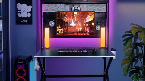 ELECWISH Multi-Functional Gaming Desk with Built-in Monitor Stand, Pegboard Hutch, RGB Lighting, Cable Management, Wireless Charger & Power Outlet, Designed for Gaming Setup