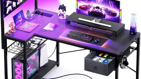 Homieasy L Shaped Gaming Desk with Drawer & Pegboard, 47 inch LED Small Computer Desk with Power Outlet & Storage Shelves, Reversible Corner Desk with Monitor Stand, Headset Hooks, Carbon Fiber Black