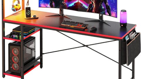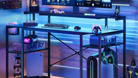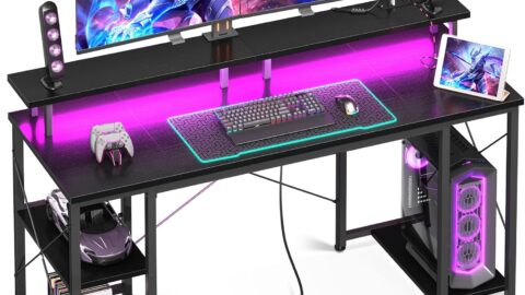 ODK 48 inch Gaming Desk with LED Lights & Power Outlets, Computer Desk with Monitor Stand & Storage Sheves, CPU Stand, Home Office Desk, Black