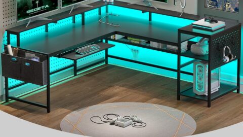 SEDETA L Shaped Gaming Desk, Reversible Computer Desk with Power Outlet and Pegboard, Gaming Desk with Led Lights, Keyboard Tray and Storage Bag for Home Office, Black