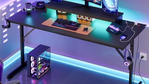 Bestier 52 inch Gaming Desk with Power Outlets and USB Charging Ports, Sturdy Computer Desk with LED Lights and Monitor Stand, Computer Table for Home Office, Easy to Assemble, Carbon Fiber Black