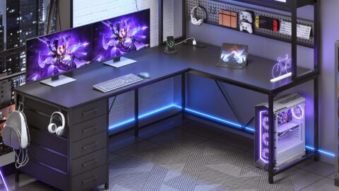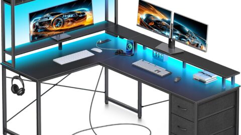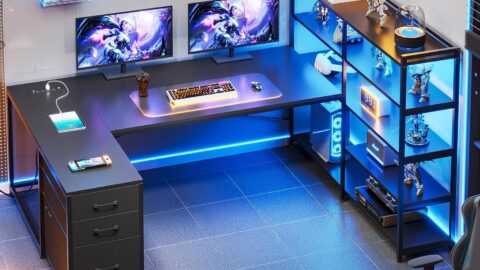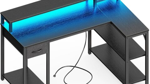 SUPERJARE 47 inch Reversible L Shaped Desk with LED Lights & Power Outlets, Computer Desk with Shelves & Monitor Stand, Gaming Desk with Drawer, Home Office Desk Corner Desk, Black