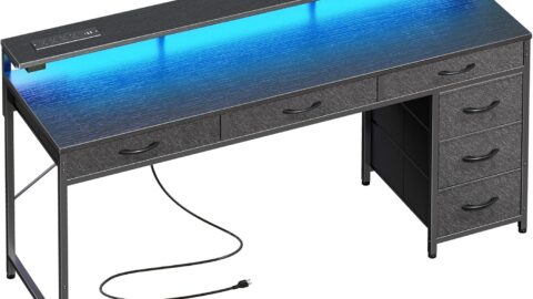 AODK Gaming Desk with LED Lights & Power Outlet, 48 Inch Computer Desk with Drawer, Reversible Desk with Adjustable Monitor Shelf & Headphone Hook for Home Office, Black