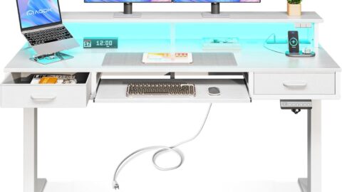 AODK Electric Standing Desk with Drawers & Keyboard Tray, 55 Inch Height Adjustable Desk with Power Outlets & LED Lights, Sit Stand Table with Monitor Stand for Home, Office, White