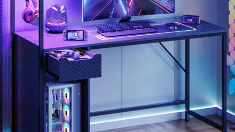 Bestier Gaming Computer Desk with Drawer, 48 inch LED Gaming Desk with Shelves, Adjustable Storage Shelves, and Headphone Hook for Bedroom and Small Spaces, Carbon Fiber Black