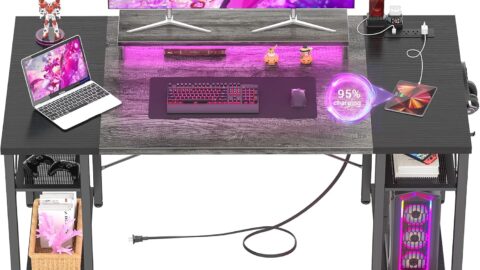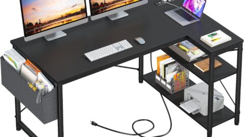 EnHomee 47″ Computer Desk with Power Outlets,L Shaped Desk with Storage Shelves,Home Offic Corner Desk for Work,Writing Study Desk with Gaming Desk for Bedroom Office Dorm,Black