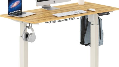 SHW Electric Height Adjustable Standing Desk with Hanging Hooks and Cable Management, 48 x 24 Inches, Oak
