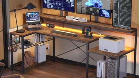 Bestier 71.5 inch Computer Desk with Power Outlets, L Shaped LED Home Office Desk with Long Monitor Stand, Large Corner Desk with Storage Shelf, Cup Holder & Headset Hooks, Modern Simple Table