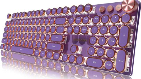 EWEADN Typewriter Style Mechanical Gaming Keyboard,104 Keys Backlit LED Keyboard, Media Control Knob, Wired Computer Keyboard Pink Switch for Windows/Mac/PC-Purple