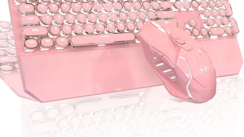 Typewriter Mechanical Gaming Keyboard and Mouse Combo, Retro Punk Round Keycaps White LED Backlit USB Wired Computer Keyboard for Game and Office, for Windows Laptop PC, Red Switches(Pink)