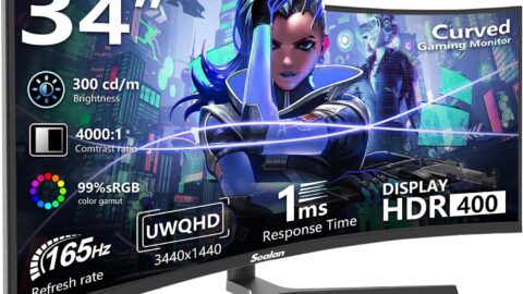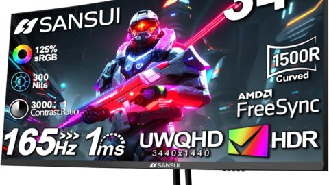 SANSUI 34-Inch Curved Gaming Monitor UWQHD 3440 x 1440 165Hz Curved 1500R – PIP/PBP, 1ms(MPRT), HDR, 300nits, sRGB 125%, DCI-P3 95%,FreeSync,HDMI2.1(TMDS) x2,DP1.4 x2(ES-G34C5 DP Cable Included)