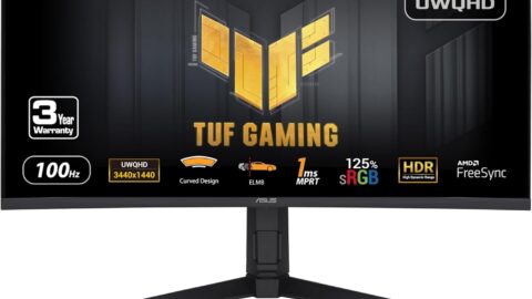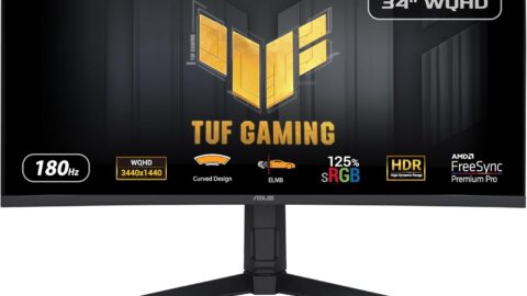 ASUS TUF Gaming 34” Ultra-Wide Curved Monitor (VG34VQ3B) – 21:9 QHD (3440×1440), 180Hz, 1ms, Extreme Low Motion Blur Sync, FreeSync Premium, Speaker, 90% DCI-P3, DisplayWidget Center, 3 yr Warranty